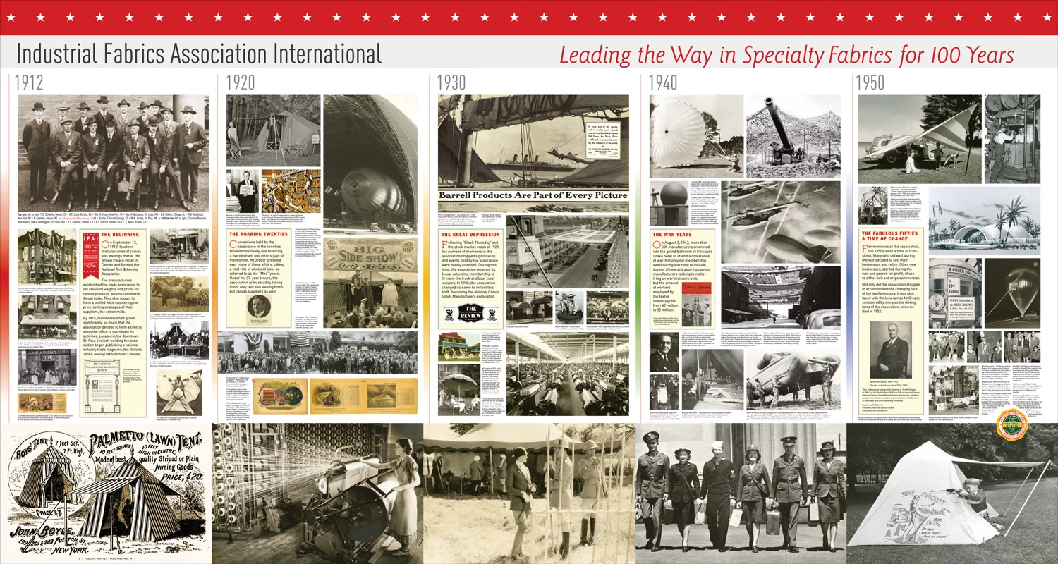 Industrial Fabrics Association International celebrated its 100th Anniversary with an exhibit of the history of the industrial fabrics industry that was installed on the trade show floor at Expo Americas 2012 in Boston. Historic photographs, documents and objects illustrated the evolution of the industry from sailcloth to nanotechnologies.