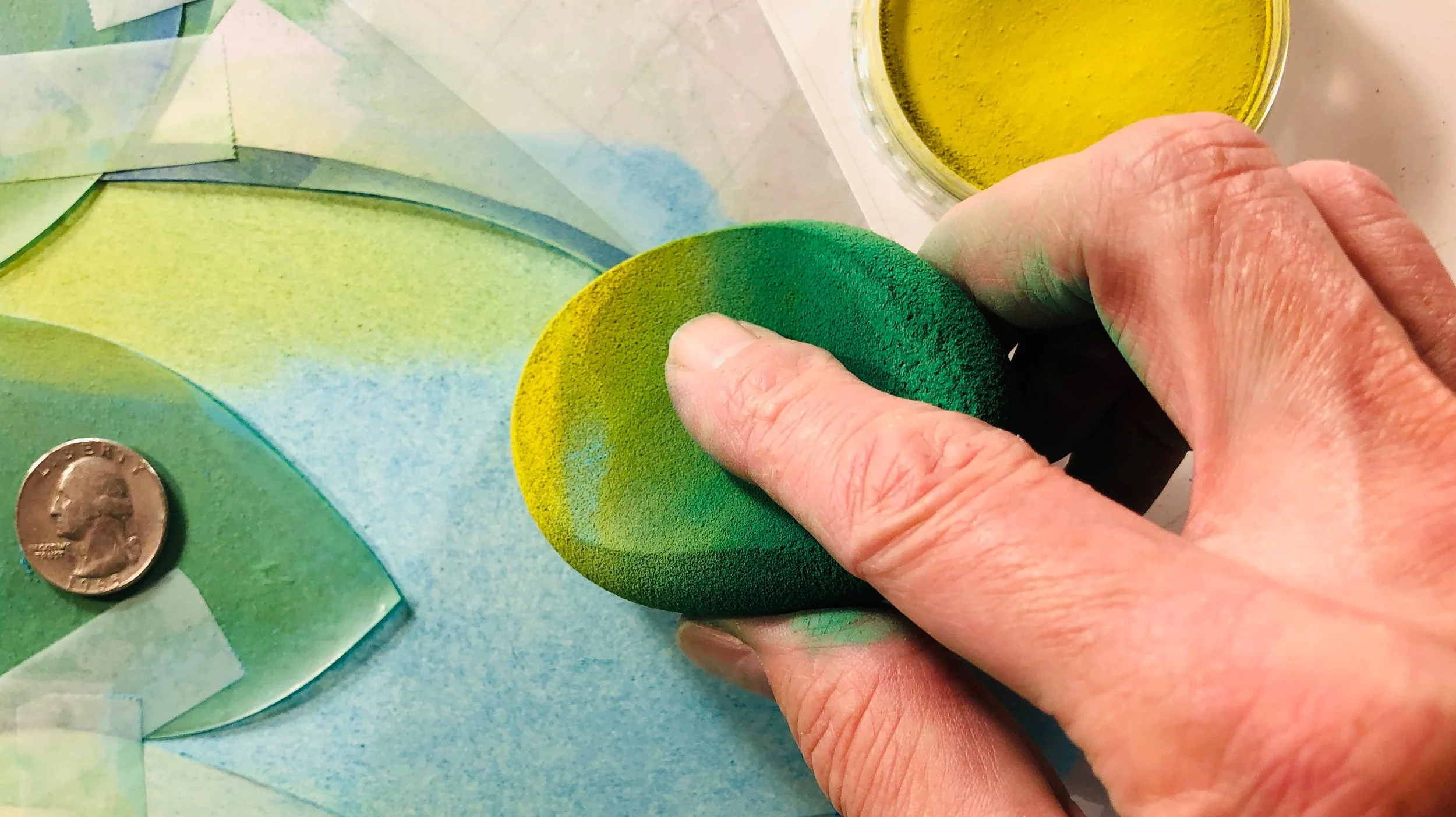 Using stencils and powdered pastels, the color is built up in each part of the composition with thin layers of pastel to match the swatch color.