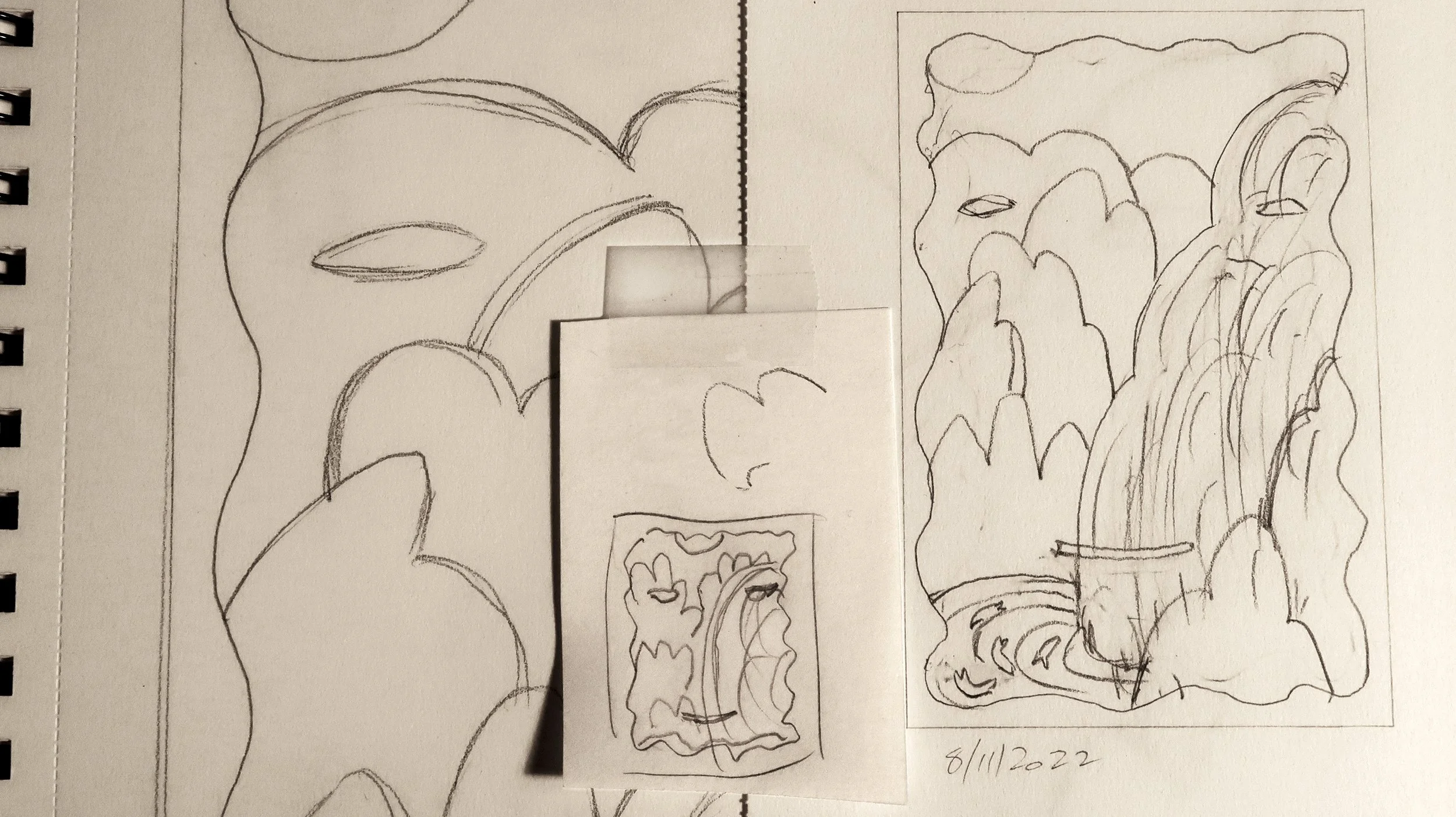 The first sketch on a post-it note (shown above) was developed, refined and enlarged up to the final, full size drawing.