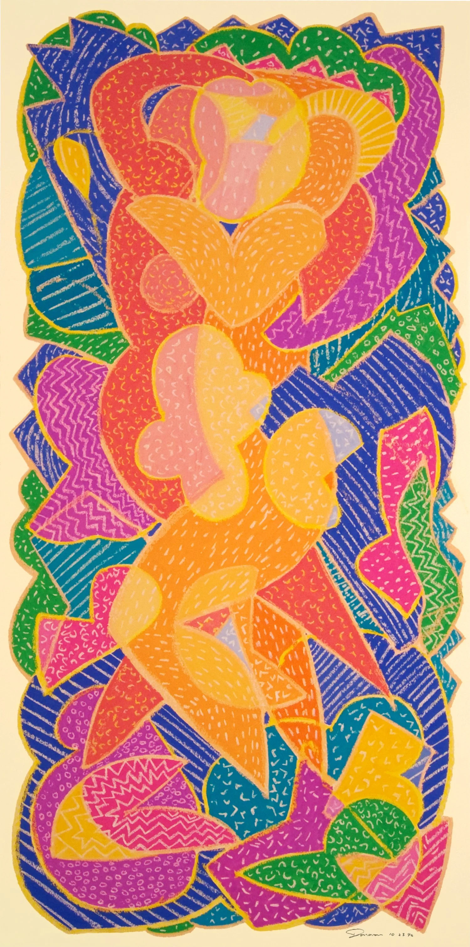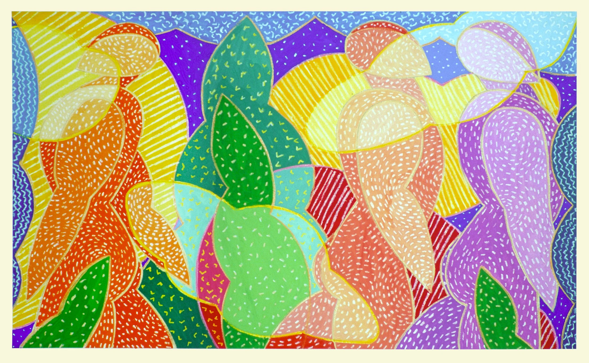 Three Men in a Garden is painted from a refined drawing where shapes and spaces were carefully worked out. The next three pieces are spontaneous drawings in oil pastel that were then painted with gouache. The oil pastel resisted the gouache* allowing the lines to show through the paint.